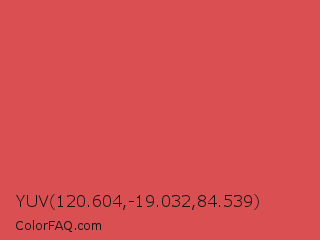 YUV 120.604,-19.032,84.539 Color is a normal red color and the nearest color is Dark Terra Cotta #cc4e5c. Hex code #d94f52 and RGB value is rgb(217,79,82). In RGB color space, this color is composed of 85% red, 31% green, 32% blue, In CMYK color space, this color is composed of 0% cyan, 64% magenta, 62% yellow , 15% black , In HSL color space, this color has a hue angle of 359° , 64% saturation and 58% lightness.