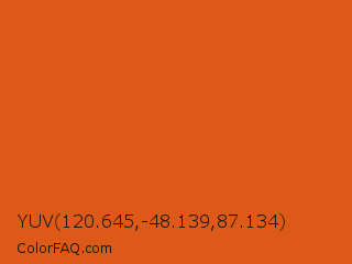 YUV 120.645,-48.139,87.134 Color is a normal orange color and the nearest color is Flame #e25822. Hex code #dc5917 and RGB value is rgb(220,89,23). In RGB color space, this color is composed of 86% red, 35% green, 9% blue, In CMYK color space, this color is composed of 0% cyan, 60% magenta, 90% yellow , 14% black , In HSL color space, this color has a hue angle of 20° , 81% saturation and 48% lightness.