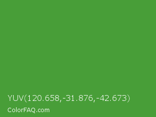 YUV 120.658,-31.876,-42.673 Color is a normal green color and the nearest color is Apple #4fa83d. Hex code #489e38 and RGB value is rgb(72,158,56). In RGB color space, this color is composed of 28% red, 62% green, 22% blue, In CMYK color space, this color is composed of 54% cyan, 0% magenta, 65% yellow , 38% black , In HSL color space, this color has a hue angle of 111° , 48% saturation and 42% lightness.