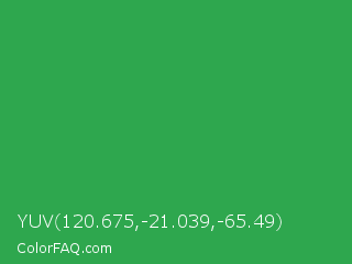 YUV 120.675,-21.039,-65.49 Color is a normal green color and the nearest color is Chateau Green #40a860. Hex code #2ea74e and RGB value is rgb(46,167,78). In RGB color space, this color is composed of 18% red, 65% green, 31% blue, In CMYK color space, this color is composed of 72% cyan, 0% magenta, 53% yellow , 35% black , In HSL color space, this color has a hue angle of 136° , 57% saturation and 42% lightness.