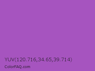 YUV 120.716,34.65,39.714 Color is a normal purple color and the nearest color is Deep Lilac #9955bb. Hex code #a654bf and RGB value is rgb(166,84,191). In RGB color space, this color is composed of 65% red, 33% green, 75% blue, In CMYK color space, this color is composed of 13% cyan, 56% magenta, 0% yellow , 25% black , In HSL color space, this color has a hue angle of 286° , 46% saturation and 54% lightness.