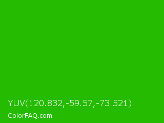 YUV 120.832,-59.57,-73.521 Color is a normal green color and the nearest color is Slimy Green #299617. Hex code #25bb00 and RGB value is rgb(37,187,-0). In RGB color space, this color is composed of 15% red, 73% green, 0% blue, In CMYK color space, this color is composed of 80% cyan, 0% magenta, 100% yellow , 27% black , In HSL color space, this color has a hue angle of 108° , 100% saturation and 37% lightness.