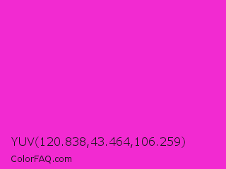 YUV 120.838,43.464,106.259 Color is a normal magenta color and the nearest color is Razzle Dazzle Rose #ff33cc. Hex code #f22ad1 and RGB value is rgb(242,42,209). In RGB color space, this color is composed of 95% red, 16% green, 82% blue, In CMYK color space, this color is composed of 0% cyan, 83% magenta, 14% yellow , 5% black , In HSL color space, this color has a hue angle of 310° , 88% saturation and 56% lightness.