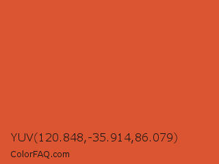 YUV 120.848,-35.914,86.079 Color is a normal red color and the nearest color is Flame Pea #da5b38. Hex code #db5530 and RGB value is rgb(219,85,48). In RGB color space, this color is composed of 86% red, 33% green, 19% blue, In CMYK color space, this color is composed of 0% cyan, 61% magenta, 78% yellow , 14% black , In HSL color space, this color has a hue angle of 13° , 70% saturation and 52% lightness.