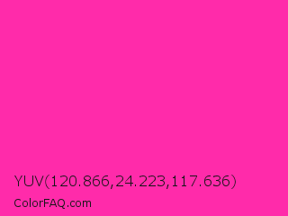 YUV 120.866,24.223,117.636 Color is a normal magenta color and the nearest color is Persian Rose #fe28a2. Hex code #ff2baa and RGB value is rgb(255,43,170). In RGB color space, this color is composed of 100% red, 17% green, 67% blue, In CMYK color space, this color is composed of 0% cyan, 83% magenta, 33% yellow , 0% black , In HSL color space, this color has a hue angle of 324° , 100% saturation and 58% lightness.