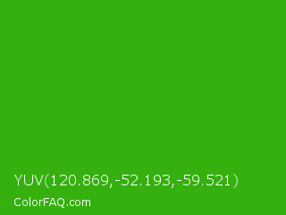 YUV 120.869,-52.193,-59.521 Color is a normal green color and the nearest color is Kelly Green #4cbb17. Hex code #35b00f and RGB value is rgb(53,176,15). In RGB color space, this color is composed of 21% red, 69% green, 6% blue, In CMYK color space, this color is composed of 70% cyan, 0% magenta, 91% yellow , 31% black , In HSL color space, this color has a hue angle of 106° , 84% saturation and 37% lightness.