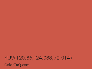YUV 120.86,-24.088,72.914 Color is a normal red color and the nearest color is Cedar Chest #c95a49. Hex code #cc5848 and RGB value is rgb(204,88,72). In RGB color space, this color is composed of 80% red, 35% green, 28% blue, In CMYK color space, this color is composed of 0% cyan, 57% magenta, 65% yellow , 20% black , In HSL color space, this color has a hue angle of 7° , 56% saturation and 54% lightness.