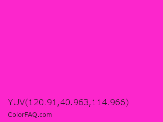 YUV 120.91,40.963,114.966 Color is a normal magenta color and the nearest color is Hot Magenta #ff1dce. Hex code #fc26cc and RGB value is rgb(252,38,204). In RGB color space, this color is composed of 99% red, 15% green, 80% blue, In CMYK color space, this color is composed of 0% cyan, 85% magenta, 19% yellow , 1% black , In HSL color space, this color has a hue angle of 313° , 97% saturation and 57% lightness.