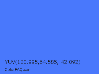 YUV 120.995,64.585,-42.092 Color is a light blue color and the nearest color is Blueberry #4f86f7. Hex code #4978fc and RGB value is rgb(73,120,252). In RGB color space, this color is composed of 29% red, 47% green, 99% blue, In CMYK color space, this color is composed of 71% cyan, 52% magenta, 0% yellow , 1% black , In HSL color space, this color has a hue angle of 224° , 97% saturation and 64% lightness.