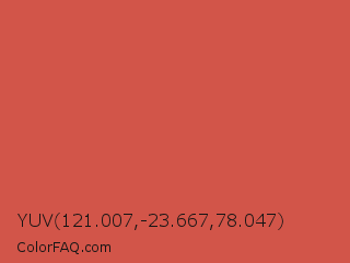 YUV 121.007,-23.667,78.047 Color is a normal red color and the nearest color is Dark Coral #cd5b45. Hex code #d25549 and RGB value is rgb(210,85,73). In RGB color space, this color is composed of 82% red, 33% green, 29% blue, In CMYK color space, this color is composed of 0% cyan, 60% magenta, 65% yellow , 18% black , In HSL color space, this color has a hue angle of 5° , 60% saturation and 55% lightness.