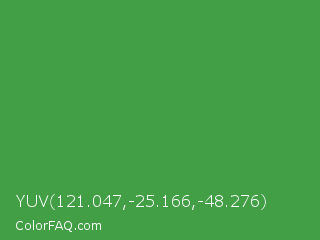 YUV 121.047,-25.166,-48.276 Color is a normal green color and the nearest color is May Green #4c9141. Hex code #429f46 and RGB value is rgb(66,159,70). In RGB color space, this color is composed of 26% red, 62% green, 27% blue, In CMYK color space, this color is composed of 58% cyan, 0% magenta, 56% yellow , 38% black , In HSL color space, this color has a hue angle of 123° , 41% saturation and 44% lightness.
