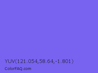 YUV 121.054,58.64,-1.801 Color is a light indigo color and the nearest color is Medium Slate Blue #7b68ee. Hex code #7763f0 and RGB value is rgb(119,99,240). In RGB color space, this color is composed of 47% red, 39% green, 94% blue, In CMYK color space, this color is composed of 50% cyan, 59% magenta, 0% yellow , 6% black , In HSL color space, this color has a hue angle of 249° , 82% saturation and 66% lightness.