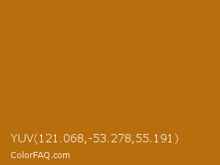 YUV 121.068,-53.278,55.191 Color is a normal orange color and the nearest color is Mai Tai #b06608. Hex code #b86e0d and RGB value is rgb(184,110,13). In RGB color space, this color is composed of 72% red, 43% green, 5% blue, In CMYK color space, this color is composed of 0% cyan, 40% magenta, 93% yellow , 28% black , In HSL color space, this color has a hue angle of 34° , 87% saturation and 39% lightness.