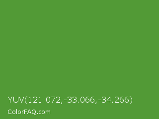 YUV 121.072,-33.066,-34.266 Color is a normal green color and the nearest color is May Green #4c9141. Hex code #529a36 and RGB value is rgb(82,154,54). In RGB color space, this color is composed of 32% red, 60% green, 21% blue, In CMYK color space, this color is composed of 47% cyan, 0% magenta, 65% yellow , 40% black , In HSL color space, this color has a hue angle of 103° , 48% saturation and 41% lightness.