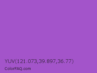 YUV 121.073,39.897,36.77 Color is a normal purple color and the nearest color is Deep Lilac #9955bb. Hex code #a354ca and RGB value is rgb(163,84,202). In RGB color space, this color is composed of 64% red, 33% green, 79% blue, In CMYK color space, this color is composed of 19% cyan, 58% magenta, 0% yellow , 21% black , In HSL color space, this color has a hue angle of 280° , 53% saturation and 56% lightness.