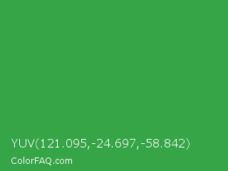 YUV 121.095,-24.697,-58.842 Color is a normal green color and the nearest color is Wageningen Green #34b233. Hex code #36a547 and RGB value is rgb(54,165,71). In RGB color space, this color is composed of 21% red, 65% green, 28% blue, In CMYK color space, this color is composed of 67% cyan, 0% magenta, 57% yellow , 35% black , In HSL color space, this color has a hue angle of 129° , 51% saturation and 43% lightness.