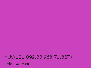 YUV 121.099,33.968,71.827 Color is a normal magenta color and the nearest color is Steel Pink #cc33cc. Hex code #cb42be and RGB value is rgb(203,66,190). In RGB color space, this color is composed of 80% red, 26% green, 75% blue, In CMYK color space, this color is composed of 0% cyan, 67% magenta, 6% yellow , 20% black , In HSL color space, this color has a hue angle of 306° , 57% saturation and 53% lightness.