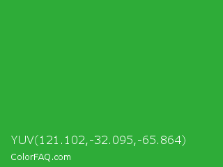 YUV 121.102,-32.095,-65.864 Color is a normal green color and the nearest color is Wageningen Green #34b233. Hex code #2eac38 and RGB value is rgb(46,172,56). In RGB color space, this color is composed of 18% red, 67% green, 22% blue, In CMYK color space, this color is composed of 73% cyan, 0% magenta, 67% yellow , 33% black , In HSL color space, this color has a hue angle of 125° , 58% saturation and 43% lightness.
