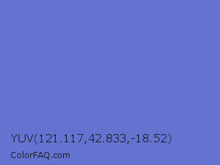 YUV 121.117,42.833,-18.52 Color is a normal blue color and the nearest color is Toolbox #746cc0. Hex code #6473d0 and RGB value is rgb(100,115,208). In RGB color space, this color is composed of 39% red, 45% green, 82% blue, In CMYK color space, this color is composed of 52% cyan, 45% magenta, 0% yellow , 18% black , In HSL color space, this color has a hue angle of 232° , 53% saturation and 60% lightness.