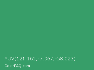 YUV 121.161,-7.967,-58.023 Color is a normal green color and the nearest color is Chateau Green #40a860. Hex code #379e69 and RGB value is rgb(55,158,105). In RGB color space, this color is composed of 22% red, 62% green, 41% blue, In CMYK color space, this color is composed of 65% cyan, 0% magenta, 34% yellow , 38% black , In HSL color space, this color has a hue angle of 149° , 48% saturation and 42% lightness.