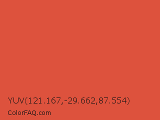 YUV 121.167,-29.662,87.554 Color is a normal red color and the nearest color is Flame Pea #da5b38. Hex code #dd523d and RGB value is rgb(221,82,61). In RGB color space, this color is composed of 87% red, 32% green, 24% blue, In CMYK color space, this color is composed of 0% cyan, 63% magenta, 72% yellow , 13% black , In HSL color space, this color has a hue angle of 8° , 70% saturation and 55% lightness.