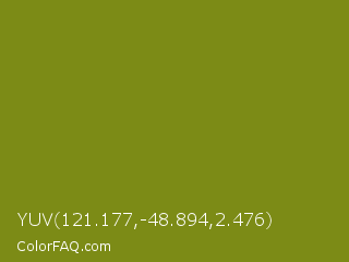 YUV 121.177,-48.894,2.476 Color is a normal yellow color and the nearest color is Trendy Green #7c881a. Hex code #7c8b16 and RGB value is rgb(124,139,22). In RGB color space, this color is composed of 49% red, 55% green, 9% blue, In CMYK color space, this color is composed of 11% cyan, 0% magenta, 84% yellow , 45% black , In HSL color space, this color has a hue angle of 68° , 73% saturation and 32% lightness.