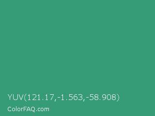 YUV 121.17,-1.563,-58.908 Color is a normal green color and the nearest color is Illuminating Emerald #319177. Hex code #369c76 and RGB value is rgb(54,156,118). In RGB color space, this color is composed of 21% red, 61% green, 46% blue, In CMYK color space, this color is composed of 65% cyan, 0% magenta, 24% yellow , 39% black , In HSL color space, this color has a hue angle of 158° , 49% saturation and 41% lightness.