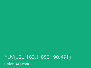 YUV 121.183,1.882,-90.491 Color is a normal green color and the nearest color is Green Crayola #1cac78. Hex code #12ad7d and RGB value is rgb(18,173,125). In RGB color space, this color is composed of 7% red, 68% green, 49% blue, In CMYK color space, this color is composed of 90% cyan, 0% magenta, 28% yellow , 32% black , In HSL color space, this color has a hue angle of 161° , 81% saturation and 37% lightness.
