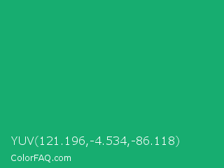 YUV 121.196,-4.534,-86.118 Color is a normal green color and the nearest color is Green Crayola #1cac78. Hex code #17ad70 and RGB value is rgb(23,173,112). In RGB color space, this color is composed of 9% red, 68% green, 44% blue, In CMYK color space, this color is composed of 87% cyan, 0% magenta, 35% yellow , 32% black , In HSL color space, this color has a hue angle of 156° , 77% saturation and 38% lightness.