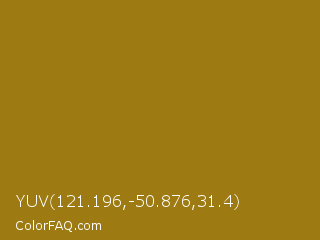 YUV 121.196,-50.876,31.4 Color is a normal orange color and the nearest color is Buttered Rum #a1750d. Hex code #9d7b12 and RGB value is rgb(157,123,18). In RGB color space, this color is composed of 62% red, 48% green, 7% blue, In CMYK color space, this color is composed of 0% cyan, 22% magenta, 89% yellow , 38% black , In HSL color space, this color has a hue angle of 45° , 79% saturation and 34% lightness.