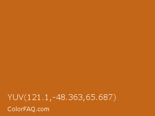 YUV 121.1,-48.363,65.687 Color is a normal orange color and the nearest color is Alloy Orange #c46210. Hex code #c46617 and RGB value is rgb(196,102,23). In RGB color space, this color is composed of 77% red, 40% green, 9% blue, In CMYK color space, this color is composed of 0% cyan, 48% magenta, 88% yellow , 23% black , In HSL color space, this color has a hue angle of 27° , 79% saturation and 43% lightness.