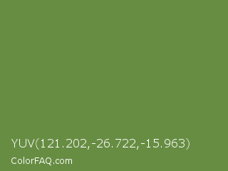 YUV 121.202,-26.722,-15.963 Color is a normal green color and the nearest color is Palm Leaf #6f9940. Hex code #678d43 and RGB value is rgb(103,141,67). In RGB color space, this color is composed of 40% red, 55% green, 26% blue, In CMYK color space, this color is composed of 27% cyan, 0% magenta, 52% yellow , 45% black , In HSL color space, this color has a hue angle of 91° , 36% saturation and 41% lightness.