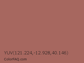 YUV 121.224,-12.928,40.146 Color is a normal red color and the nearest color is Blast Off Bronze #a57164. Hex code #a7675f and RGB value is rgb(167,103,95). In RGB color space, this color is composed of 65% red, 40% green, 37% blue, In CMYK color space, this color is composed of 0% cyan, 38% magenta, 43% yellow , 35% black , In HSL color space, this color has a hue angle of 7° , 29% saturation and 51% lightness.