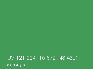 YUV 121.224,-16.872,-48.431 Color is a normal green color and the nearest color is Fruit Salad #4f9d5d. Hex code #429c57 and RGB value is rgb(66,156,87). In RGB color space, this color is composed of 26% red, 61% green, 34% blue, In CMYK color space, this color is composed of 58% cyan, 0% magenta, 44% yellow , 39% black , In HSL color space, this color has a hue angle of 134° , 41% saturation and 44% lightness.
