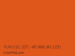 YUV 121.237,-45.966,90.123 Color is a normal orange color and the nearest color is Flame #e25822. Hex code #e0571c and RGB value is rgb(224,87,28). In RGB color space, this color is composed of 88% red, 34% green, 11% blue, In CMYK color space, this color is composed of 0% cyan, 61% magenta, 88% yellow , 12% black , In HSL color space, this color has a hue angle of 18° , 78% saturation and 49% lightness.