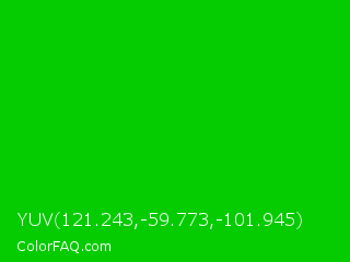 YUV 121.243,-59.773,-101.945 Color is a normal green color and the nearest color is Green #00ff00. Hex code #05cc00 and RGB value is rgb(5,204,-0). In RGB color space, this color is composed of 2% red, 80% green, 0% blue, In CMYK color space, this color is composed of 98% cyan, 0% magenta, 100% yellow , 20% black , In HSL color space, this color has a hue angle of 119° , 100% saturation and 40% lightness.