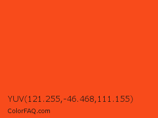YUV 121.255,-46.468,111.155 Color is a normal red color and the nearest color is Orioles Orange #fb4f14. Hex code #f84b1b and RGB value is rgb(248,75,27). In RGB color space, this color is composed of 97% red, 29% green, 11% blue, In CMYK color space, this color is composed of 0% cyan, 70% magenta, 89% yellow , 3% black , In HSL color space, this color has a hue angle of 13° , 94% saturation and 54% lightness.