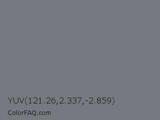 YUV 121.26,2.337,-2.859 Color is a normal blue color and the nearest color is Boulder #7a7a7a. Hex code #767a7e and RGB value is rgb(118,122,126). In RGB color space, this color is composed of 46% red, 48% green, 49% blue, In CMYK color space, this color is composed of 6% cyan, 3% magenta, 0% yellow , 51% black , In HSL color space, this color has a hue angle of 210° , 3% saturation and 48% lightness.