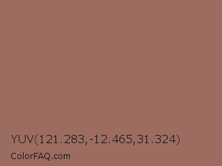 YUV 121.283,-12.465,31.324 Color is a normal red color and the nearest color is Toast #9a6e61. Hex code #9d6c60 and RGB value is rgb(157,108,96). In RGB color space, this color is composed of 62% red, 42% green, 38% blue, In CMYK color space, this color is composed of 0% cyan, 31% magenta, 39% yellow , 38% black , In HSL color space, this color has a hue angle of 12° , 24% saturation and 50% lightness.