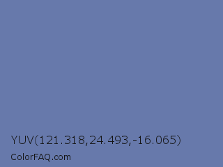 YUV 121.318,24.493,-16.065 Color is a normal blue color and the nearest color is Glaucous #6082b6. Hex code #6779ab and RGB value is rgb(103,121,171). In RGB color space, this color is composed of 40% red, 47% green, 67% blue, In CMYK color space, this color is composed of 40% cyan, 29% magenta, 0% yellow , 33% black , In HSL color space, this color has a hue angle of 224° , 29% saturation and 54% lightness.