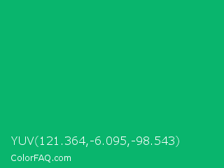 YUV 121.364,-6.095,-98.543 Color is a normal green color and the nearest color is GO Green #00ab66. Hex code #09b56d and RGB value is rgb(9,181,109). In RGB color space, this color is composed of 4% red, 71% green, 43% blue, In CMYK color space, this color is composed of 95% cyan, 0% magenta, 40% yellow , 29% black , In HSL color space, this color has a hue angle of 155° , 91% saturation and 37% lightness.