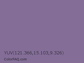 YUV 121.366,15.103,9.326 Color is a normal purple color and the nearest color is Trendy Pink #8c6495. Hex code #846e98 and RGB value is rgb(132,110,152). In RGB color space, this color is composed of 52% red, 43% green, 60% blue, In CMYK color space, this color is composed of 13% cyan, 28% magenta, 0% yellow , 40% black , In HSL color space, this color has a hue angle of 271° , 17% saturation and 51% lightness.