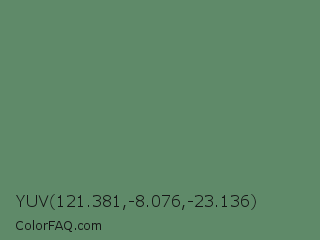 YUV 121.381,-8.076,-23.136 Color is a normal green color and the nearest color is Russian Green #679267. Hex code #5f8a69 and RGB value is rgb(95,138,105). In RGB color space, this color is composed of 37% red, 54% green, 41% blue, In CMYK color space, this color is composed of 31% cyan, 0% magenta, 24% yellow , 46% black , In HSL color space, this color has a hue angle of 134° , 18% saturation and 46% lightness.