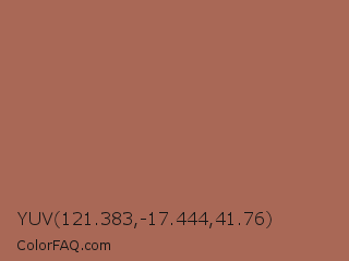 YUV 121.383,-17.444,41.76 Color is a normal red color and the nearest color is Santa Fe #b16d52. Hex code #a96856 and RGB value is rgb(169,104,86). In RGB color space, this color is composed of 66% red, 41% green, 34% blue, In CMYK color space, this color is composed of 0% cyan, 38% magenta, 49% yellow , 34% black , In HSL color space, this color has a hue angle of 13° , 33% saturation and 50% lightness.