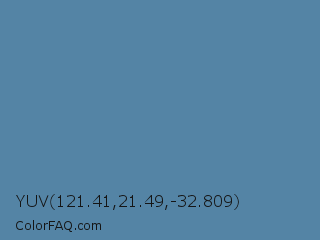 YUV 121.41,21.49,-32.809 Color is a normal blue color and the nearest color is Horizon #5a87a0. Hex code #5484a5 and RGB value is rgb(84,132,165). In RGB color space, this color is composed of 33% red, 52% green, 65% blue, In CMYK color space, this color is composed of 49% cyan, 20% magenta, 0% yellow , 35% black , In HSL color space, this color has a hue angle of 204° , 33% saturation and 49% lightness.