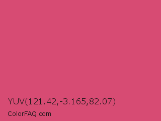 YUV 121.42,-3.165,82.07 Color is a normal rose color and the nearest color is Cabaret #d94972. Hex code #d74b73 and RGB value is rgb(215,75,115). In RGB color space, this color is composed of 84% red, 29% green, 45% blue, In CMYK color space, this color is composed of 0% cyan, 65% magenta, 47% yellow , 16% black , In HSL color space, this color has a hue angle of 343° , 64% saturation and 57% lightness.