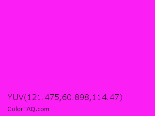 YUV 121.475,60.898,114.47 Color is a normal magenta color and the nearest color is Magenta / Fuchsia #ff00ff. Hex code #fc1ff5 and RGB value is rgb(252,31,245). In RGB color space, this color is composed of 99% red, 12% green, 96% blue, In CMYK color space, this color is composed of 0% cyan, 88% magenta, 3% yellow , 1% black , In HSL color space, this color has a hue angle of 302° , 97% saturation and 55% lightness.