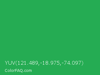YUV 121.489,-18.975,-74.097 Color is a normal green color and the nearest color is Chateau Green #40a860. Hex code #25ac53 and RGB value is rgb(37,172,83). In RGB color space, this color is composed of 15% red, 67% green, 33% blue, In CMYK color space, this color is composed of 78% cyan, 0% magenta, 52% yellow , 33% black , In HSL color space, this color has a hue angle of 140° , 65% saturation and 41% lightness.