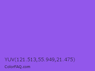 YUV 121.513,55.949,21.475 Color is a light violet color and the nearest color is Navy Purple #9457eb. Hex code #9257eb and RGB value is rgb(146,87,235). In RGB color space, this color is composed of 57% red, 34% green, 92% blue, In CMYK color space, this color is composed of 38% cyan, 63% magenta, 0% yellow , 8% black , In HSL color space, this color has a hue angle of 264° , 79% saturation and 63% lightness.