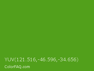 YUV 121.516,-46.596,-34.656 Color is a normal green color and the nearest color is Vida Loca #549019. Hex code #52a01b and RGB value is rgb(82,160,27). In RGB color space, this color is composed of 32% red, 63% green, 11% blue, In CMYK color space, this color is composed of 49% cyan, 0% magenta, 83% yellow , 37% black , In HSL color space, this color has a hue angle of 95° , 71% saturation and 37% lightness.